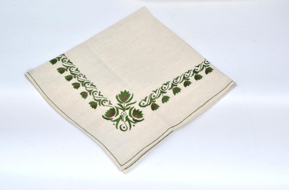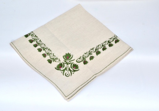 Az asztalterítőt a debreceni kisbunda hímzés motívuma díszíti, a formájához jól igazodik a visszafogott minta. Színvilágában hagyományosan követi az egykori kisbunda hímzés díszítményét. Technikailag szépen kivitelezett, egyenletes hímzés.