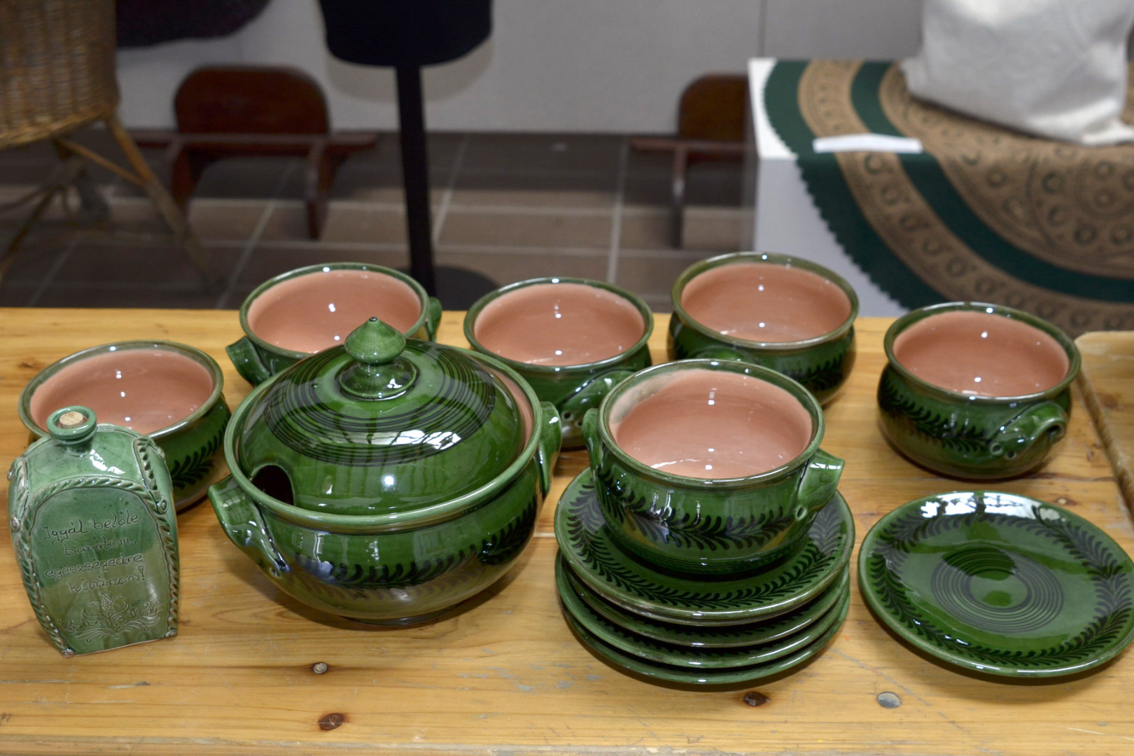 A termékeit kézi korongolással, hagyományos mezőtúri motívummal készíti, zöld mázas, karcolással díszíti.