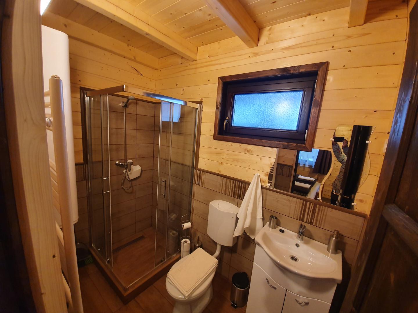 - fürdőszoba: zuhanykabin, mosdó, WC, törülközők, hajszárító