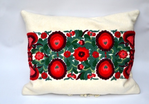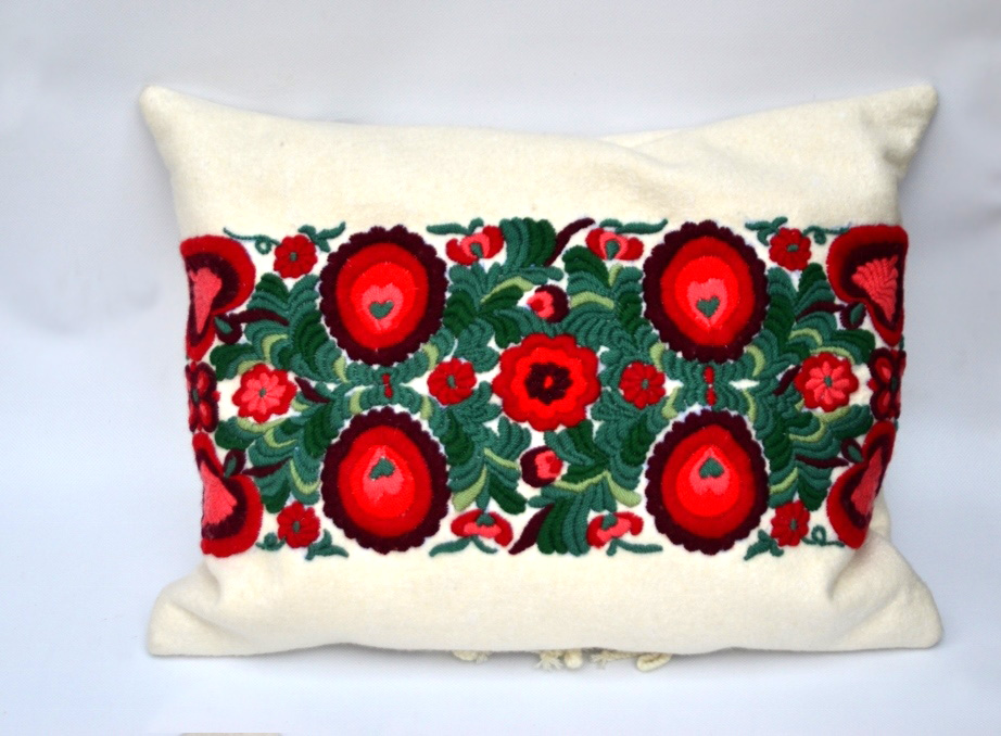 A díszpárna a debreceni cifraszűr sokszínű díszítményvilágából egy kevésbé ismert színvilágot jelenít meg. Szépen kivitelezett termék, a színek harmonizálnak. A díszpárna alapanyaga filc, gyapjú cérnával ráhímezve.