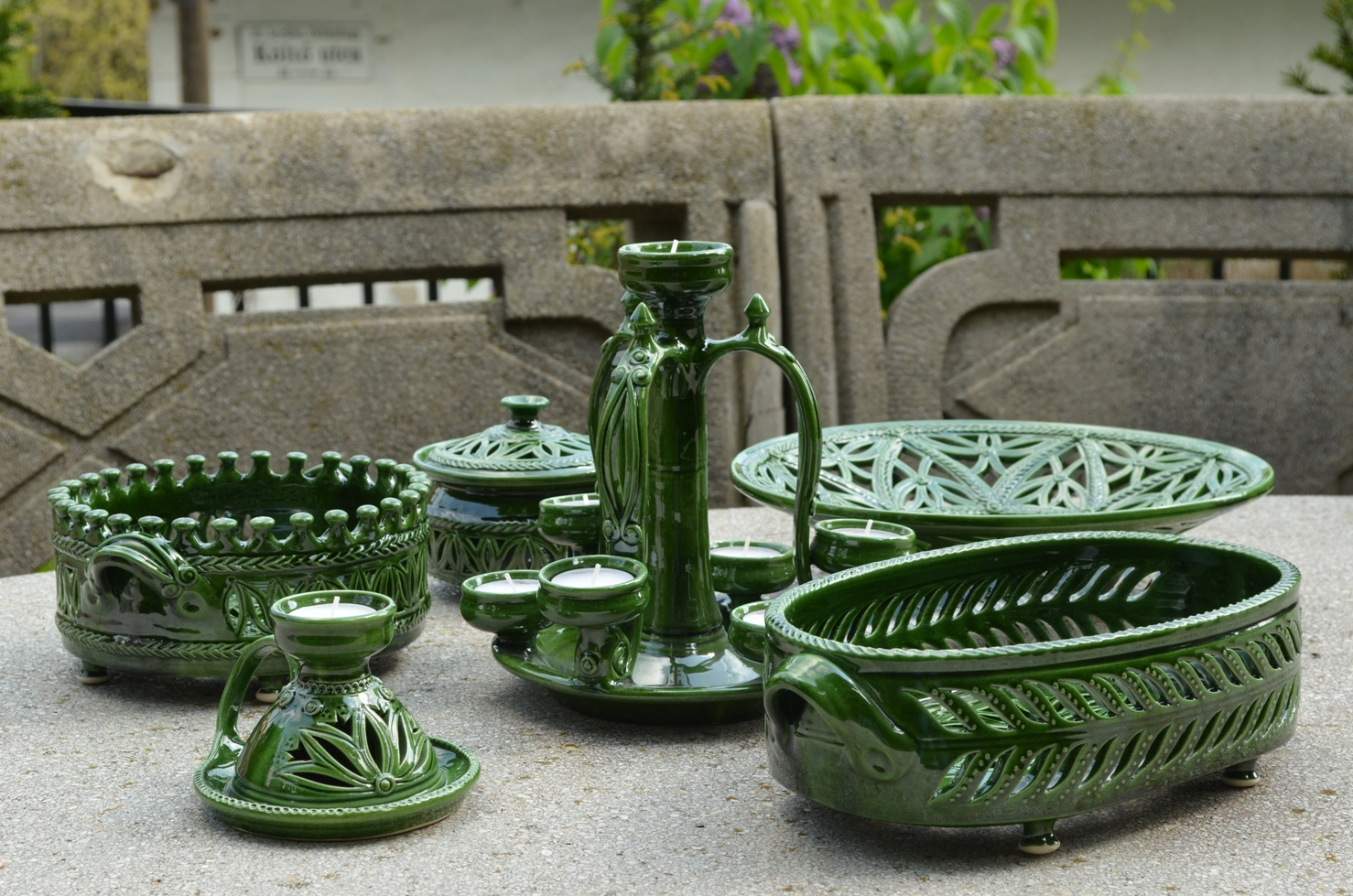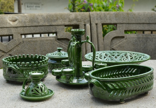 Bírálatra benyújtott termékei: zöld áttört tányér, ovális áttört gyümölcsös tál, koronás áttört gyümölcsös tál, mécsestartó, hetes mécsestartó, ékszeres dobozka.