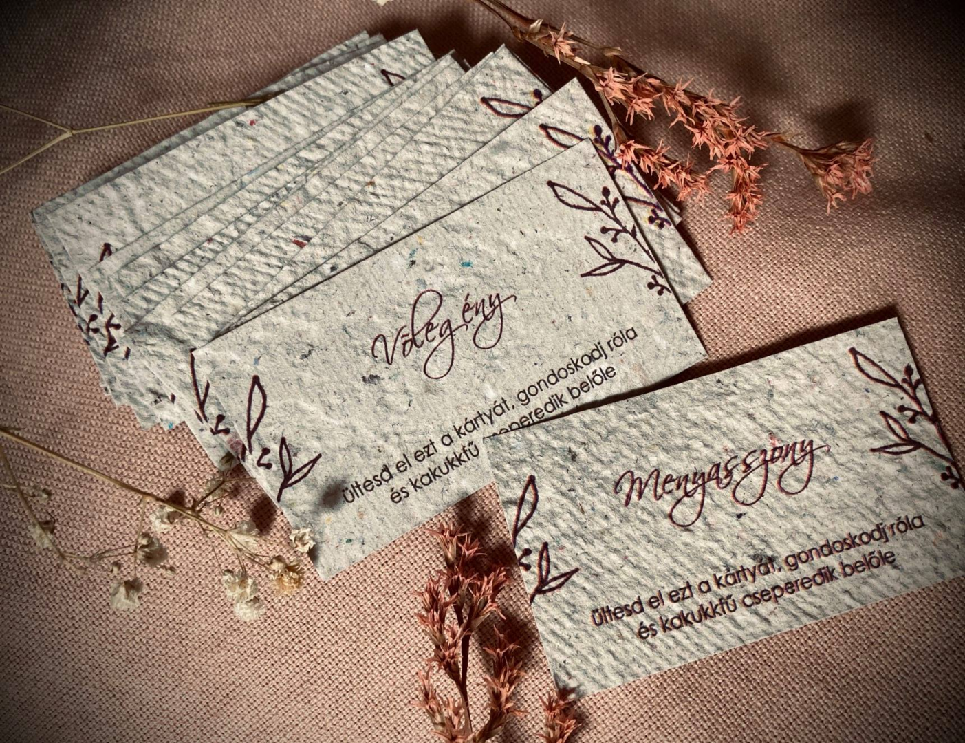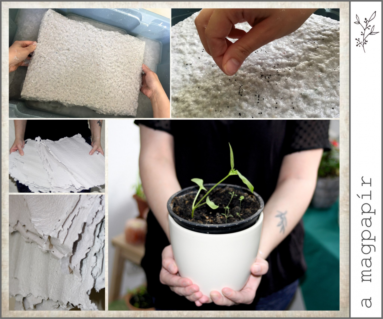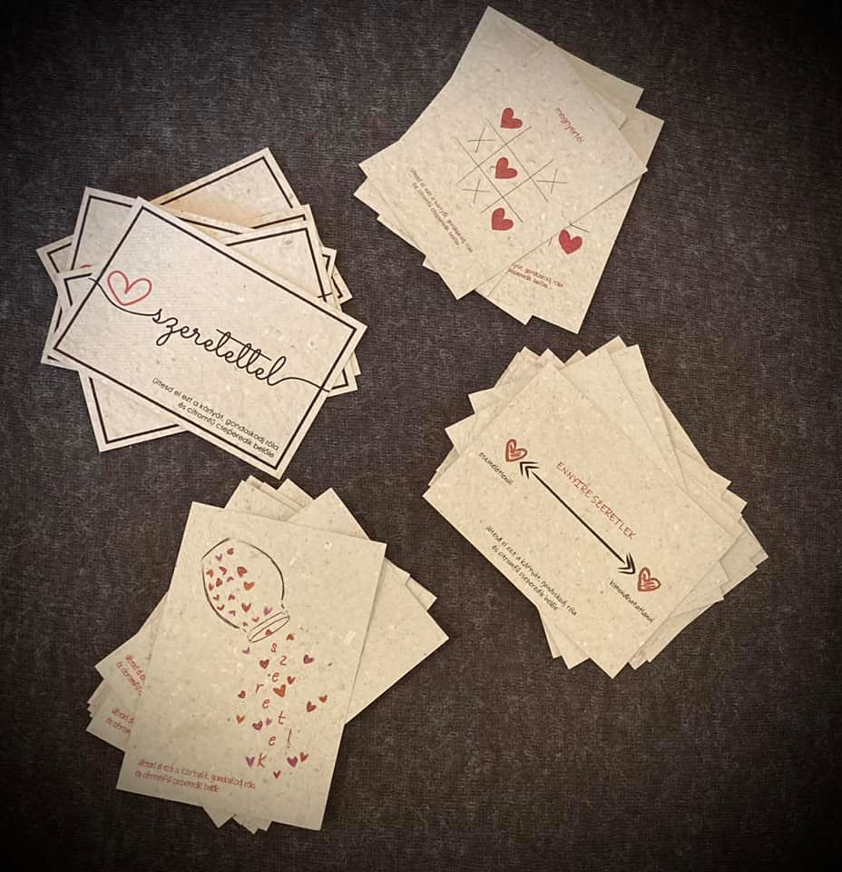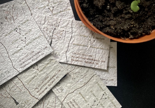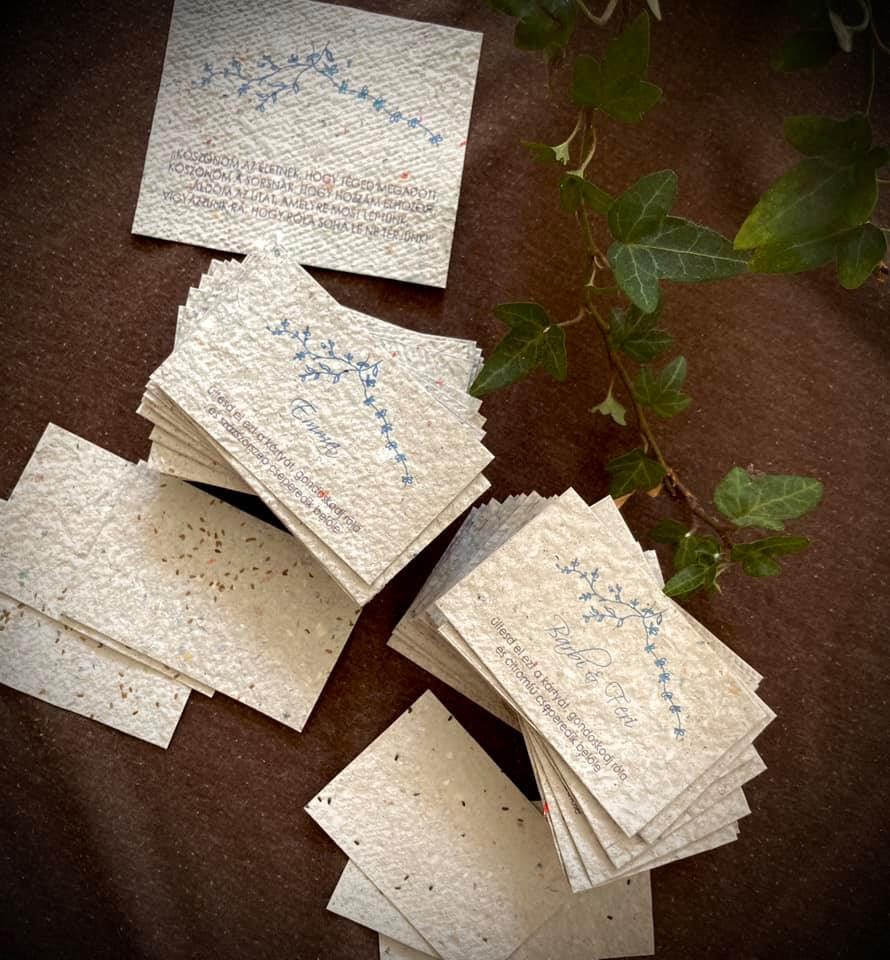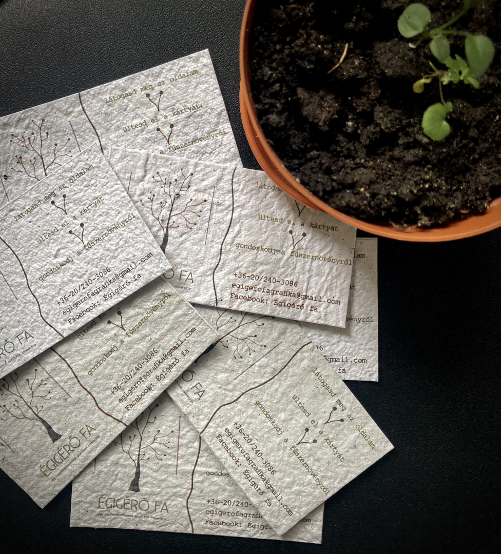 A magpapír ötlete 2020 elején talált rám. Csodálatosnak tartottam az ötletet, hogy nem kell senkinek külön komódot fenntartania ahhoz, hogy megtartsa minden ismerősétől kapott esküvői vagy ballagási meghívóját, névjegykártyáját, ajándékutalványát. Helyette elültetheti, és illatos fűszernövény vagy csinos kis virág nőhet belőle. Keresgéltem, de nem találtam olyan céget, amelyik nyomtatásra alkalmas magpapírt árulna megfizethető áron, így hát elkezdtem kísérletezni. Készítgettem a papírokat, és bár nagy százalékban kinőttek a kis növénykéim, egyszerűen egyik papír sem volt alkalmas arra, hogy nyomtassak, vagy akár kényelmesen írjak rá. Egyszer csak bevette a nyomtatóm, majd apró darabkákra szakadt a gépen belül. Jó sok időbe telt a kipucolása, de olyan nagyon boldog voltam. A következő két adag papír megint nem sikerült, én pedig kezdtem – csak egy egészen ici-picikét – elkeseredni. Elég az hozzá, hogy varázslatos módon éppen a 8. adagot vitte el tökéletesen a gépem, rányomtatva a logómat. A 8 a kedvenc számom. Így kellett lennie.