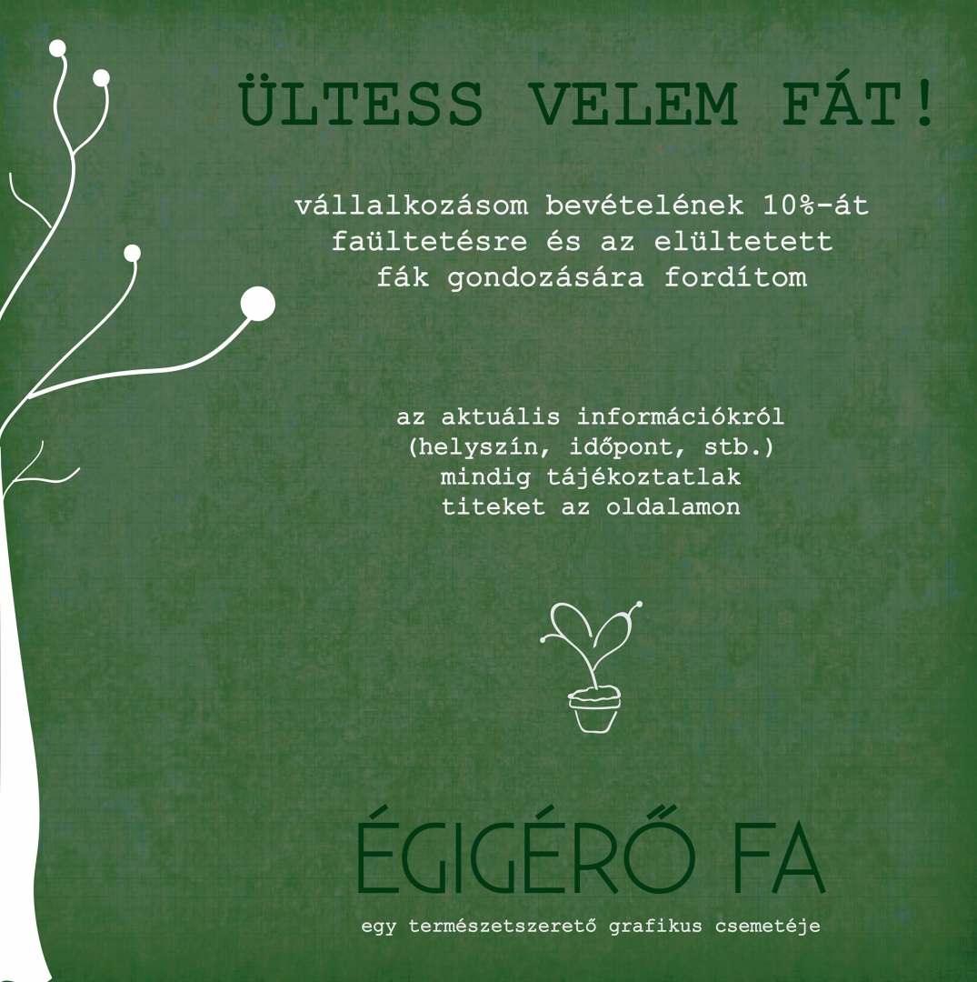 Az Égigérő fa egy tökmag leány óriási álma. Lelkes környezetvédőként sokat bánkódtam azon, hogy mennyi szemetet termel egy grafikai cég, mire rájöttem, hogy ez igazán csak hozzáállás és erős akarat kérdése. Ezért kezdtem bele saját vállalkozásomba, ahol azt csinálhatom, amit igazán szeretek és úgy, ahogy én szeretném. Munkámban azt tartom szem előtt, hogy ne ártsak a természetnek. A nyomtatott anyagoknál igyekszem a lehető legfenntarthatóbb megoldásokat választani. Kizárólag öko papírokra dolgozom, természetes kellékekkel, energiatakarékos nyomtatóval. Nem utolsó sorban pedig a mindennapjaimat is a környezettudatosság jegyében élem.