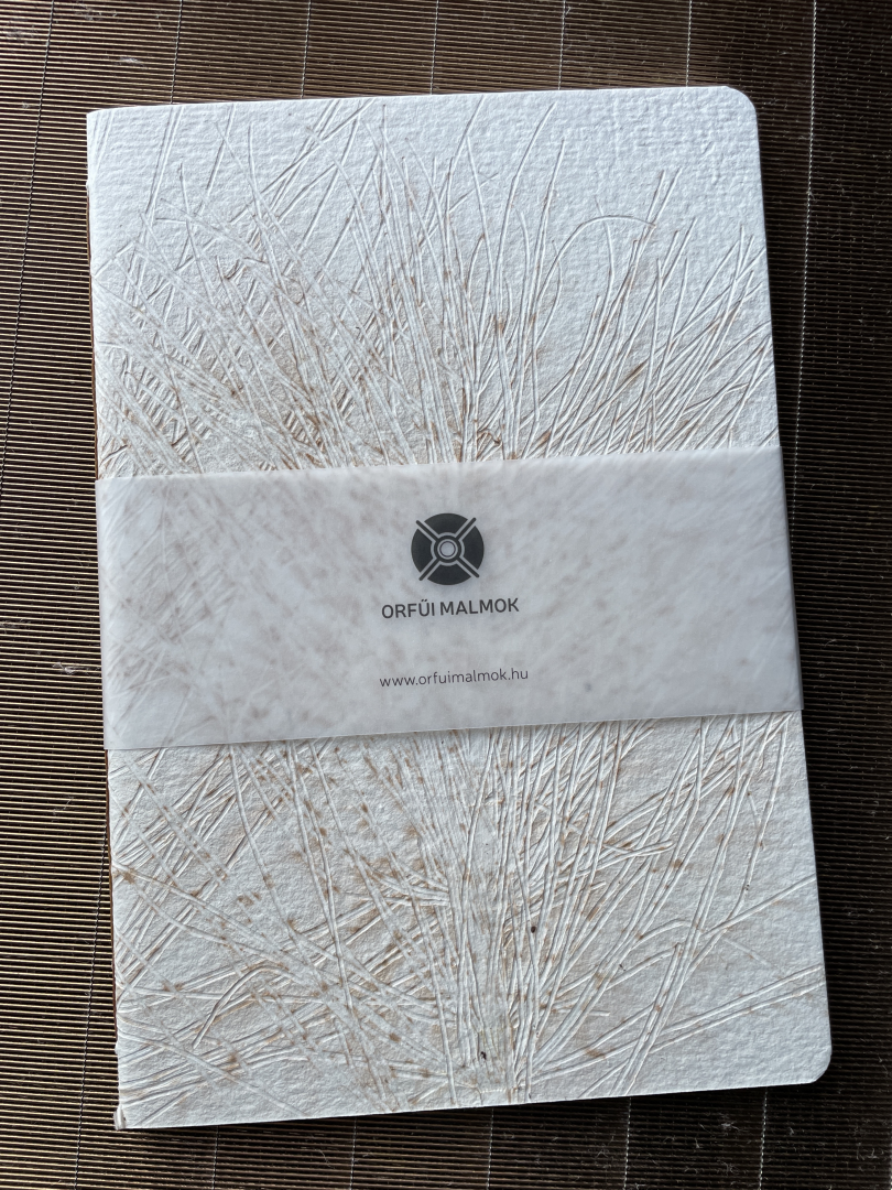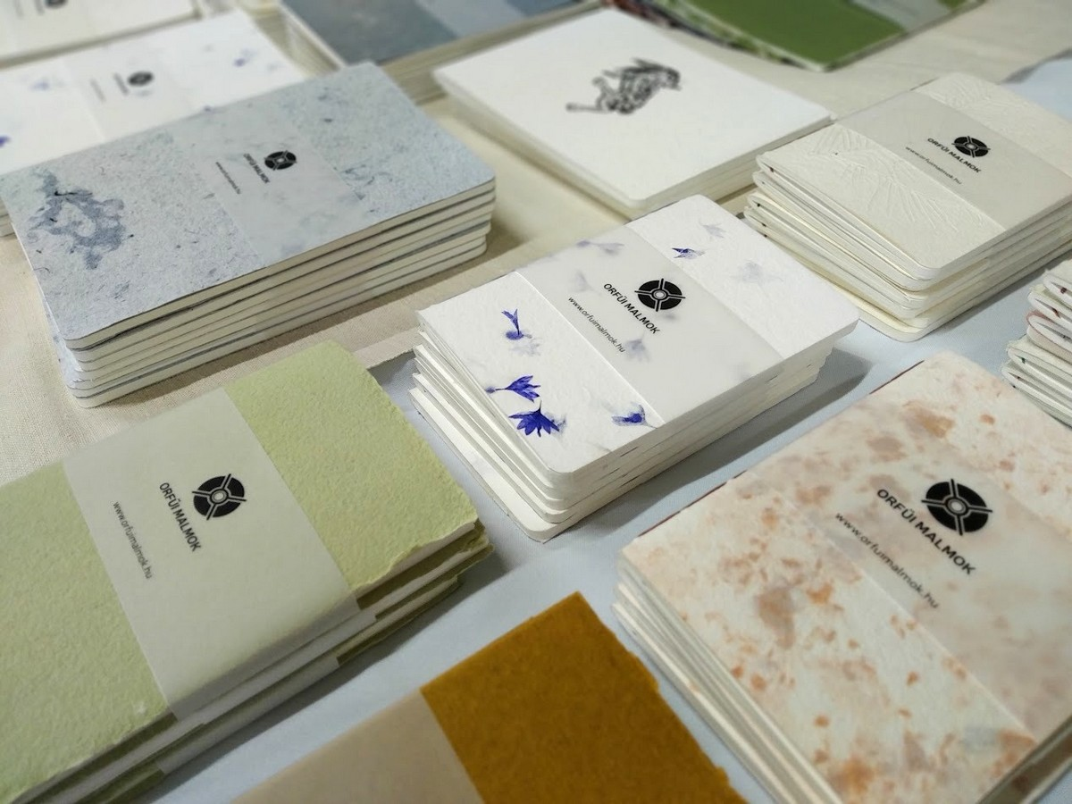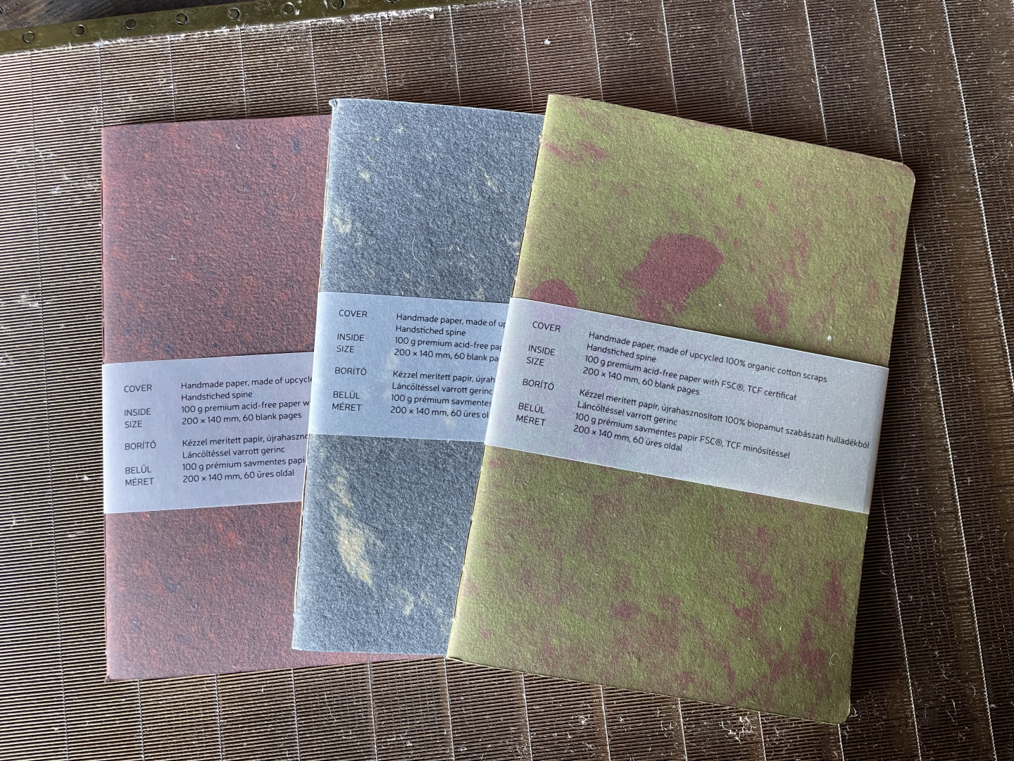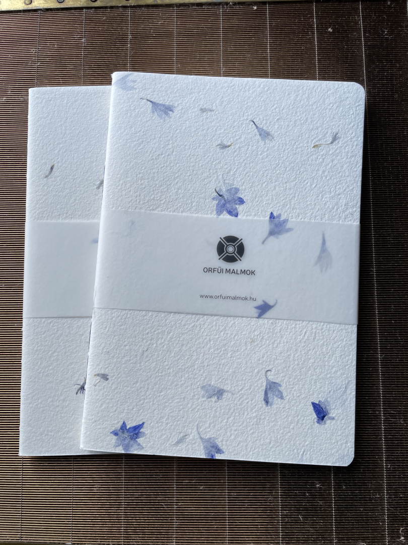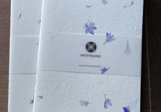 Merített füzetek: Teljes egészében kézifűzéssel készültnek az Orfűi Malmok papírmalom könyvkötő műhelyében. Borítónak az általuk merített nagyobb vastagságú lapokat, a balső ívekhez Bio Top 3® prémium papírt használnak, mely rendelkezik FSC, european Ecolable és TCF tanúsítvánnyal. A füzetek gerincét különböző öltési technikákat alkalmazva, pamut cérnával varrják meg.