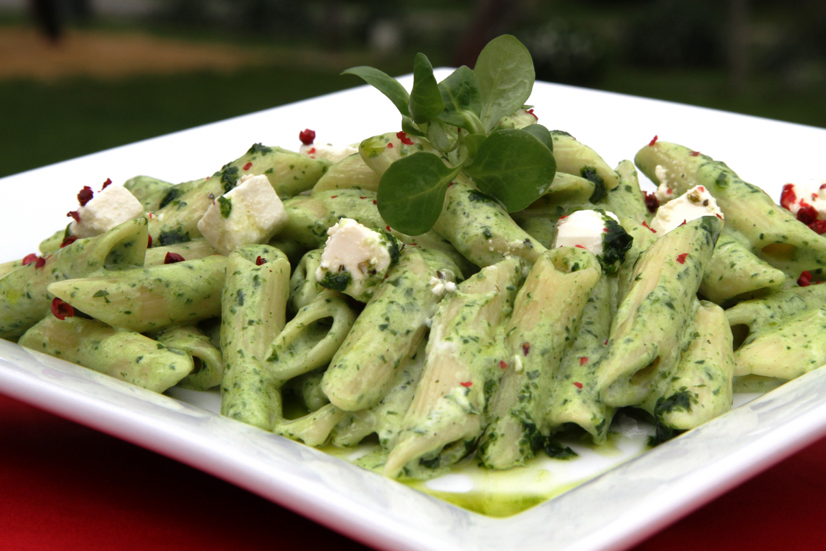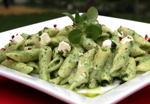 Medvehagyma pesto-s tészta: kifőzött penne tészta, medvehagymás pesto-val nyakonöntve, pácolt feta sajttal tálalva.