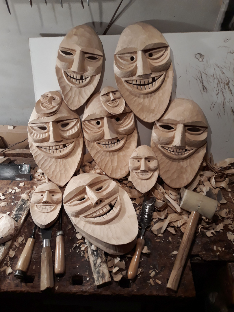 Maszkjait különböző méretekben készíti, de mint minden maszkfaragó saját kézjegyét viselik termékei.