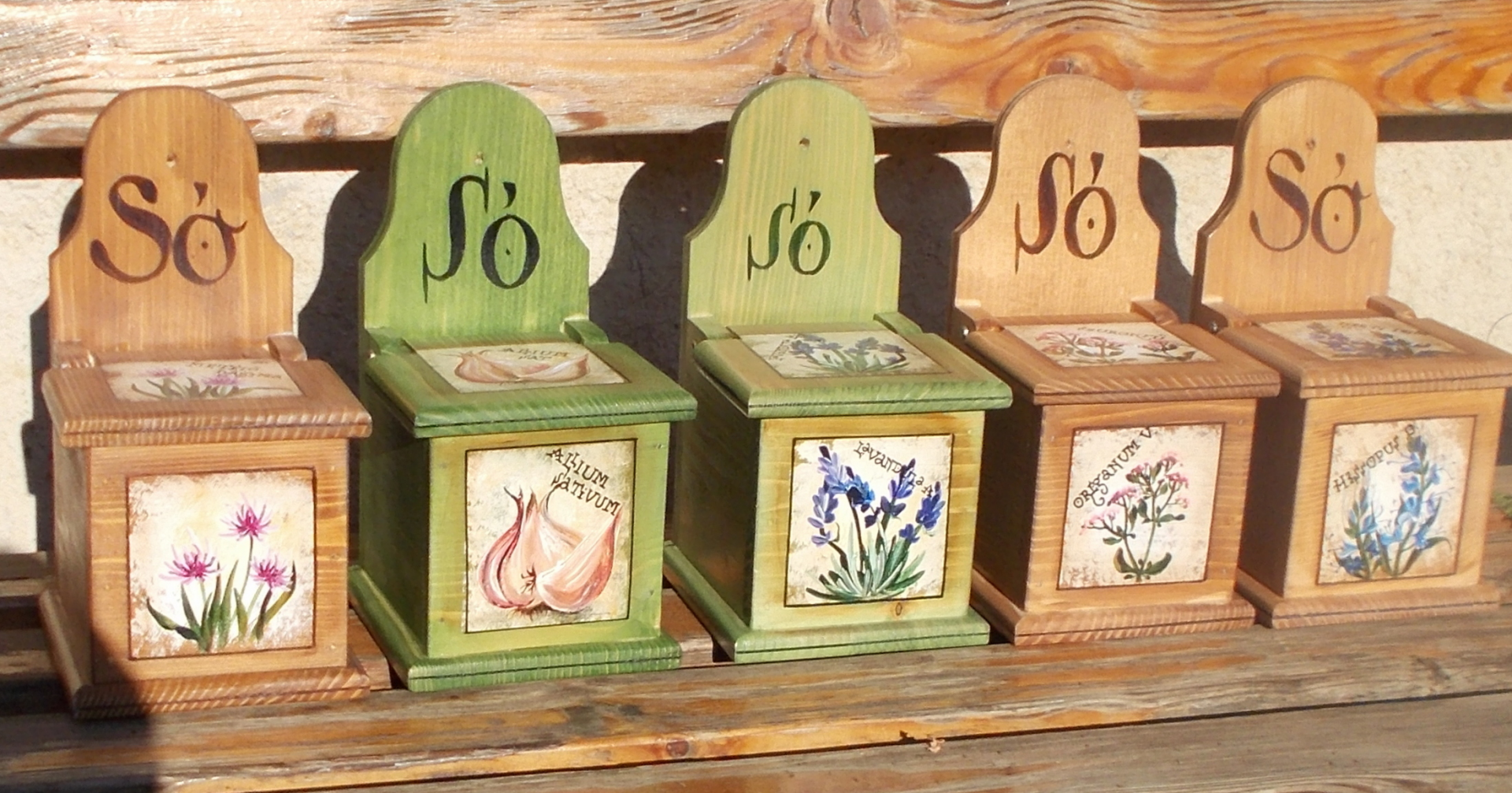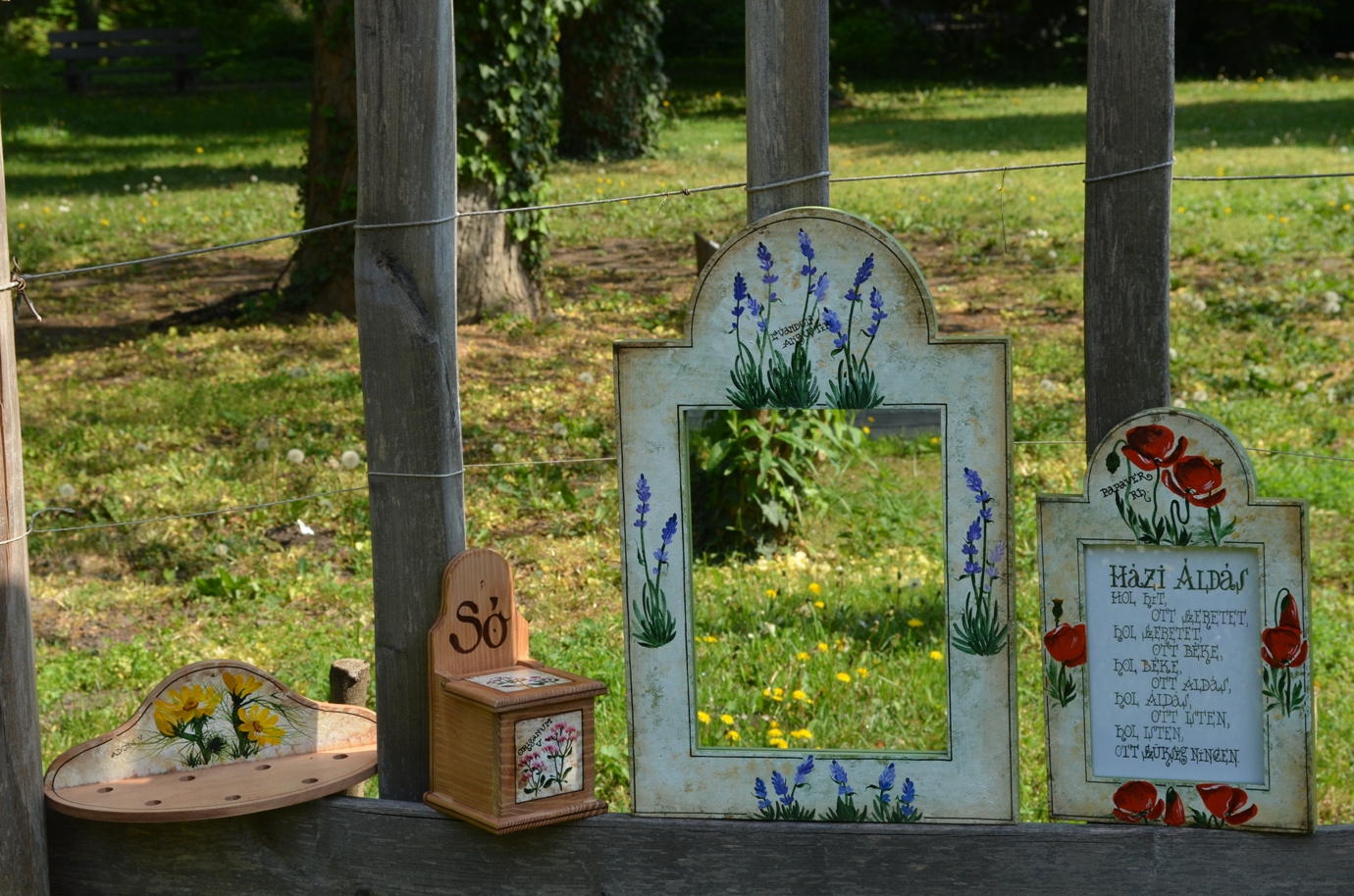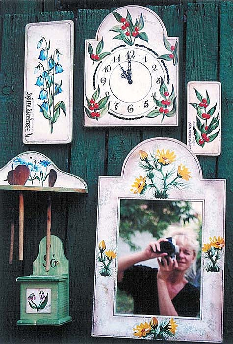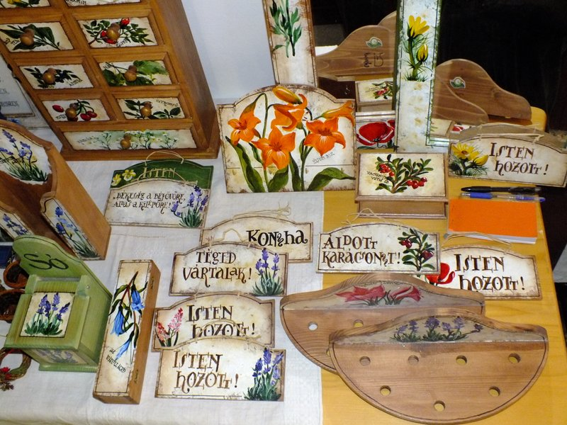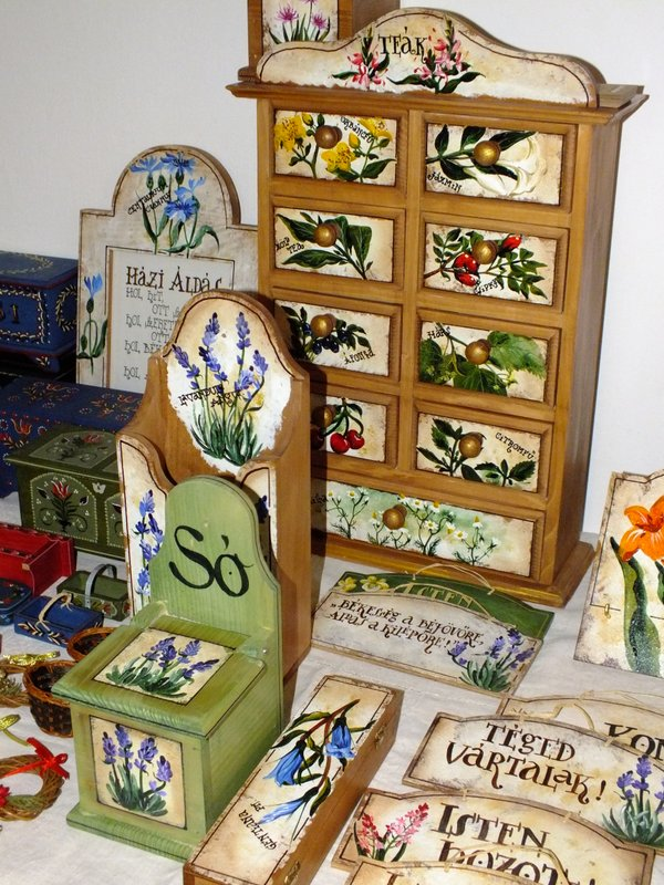 Kézzel festett használati tárgyak fenyőfából, amelyek díszítménye a környékre, ill. a DINPI területére jellemző gyógynövény vagy réti virág, esetleg fűszernövény. A tárgyak mintáit saját fotózásból, megfigyelésből vagy Farkas Sándor Magyarország védett növényei c. könyvéből meríti.