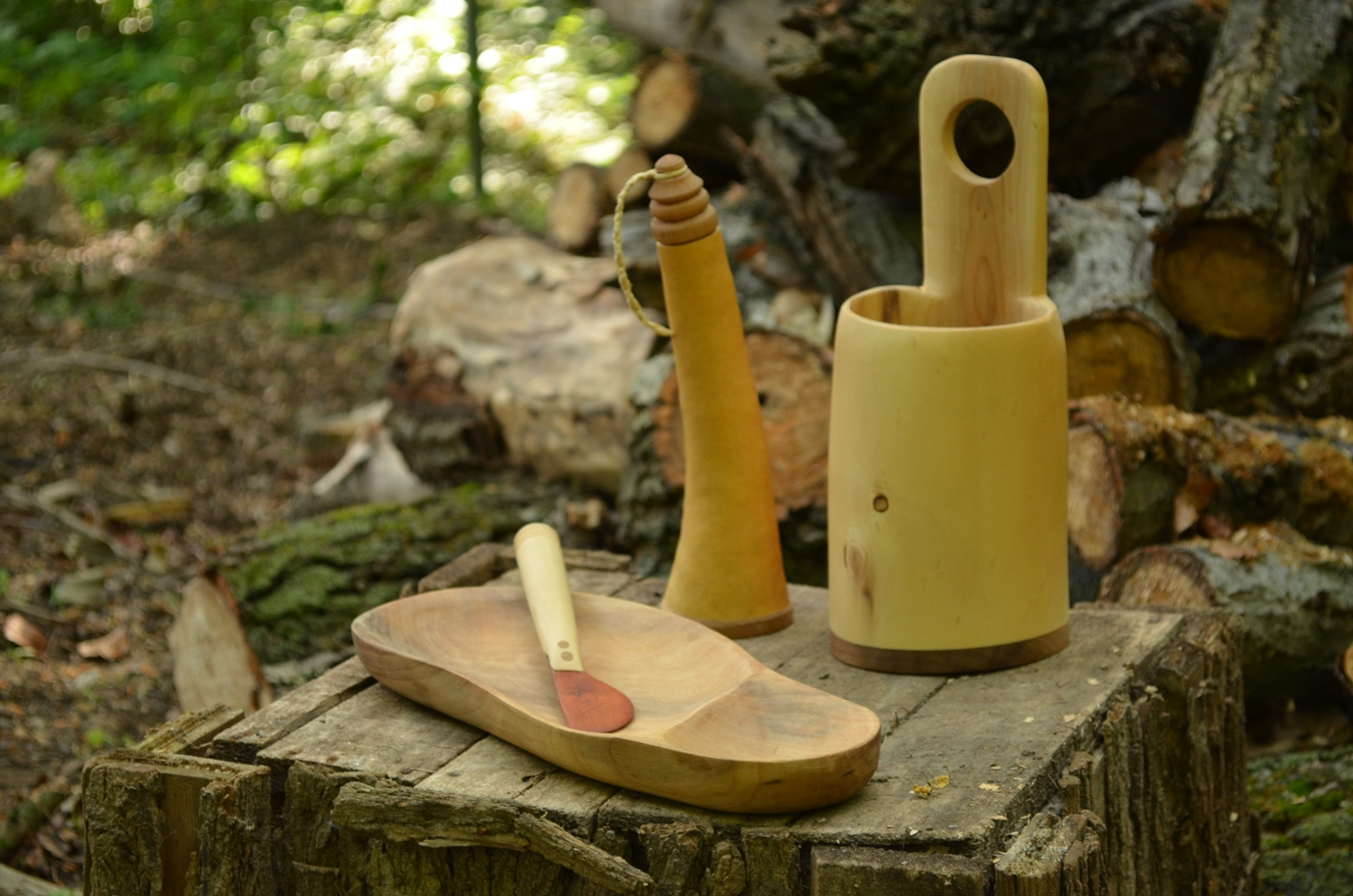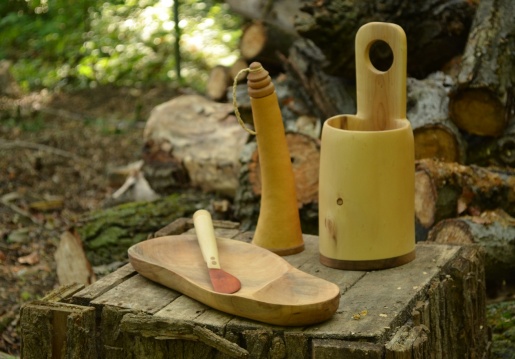 Vajazó- és kenőkés: esztergálással és csapolással készült fa evőeszköz.