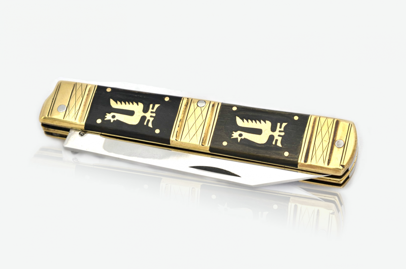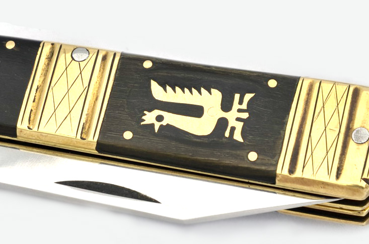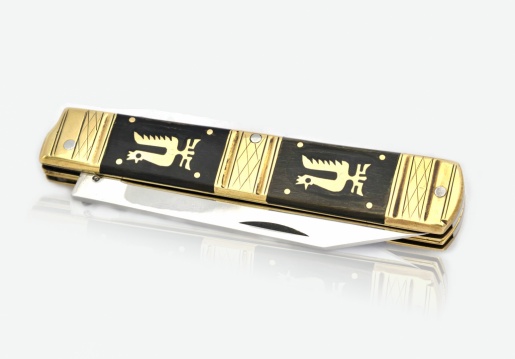 Bajonett szárral. Különálló késre és villára bontható eszköz. A nyele berakásokkal, vésésekkel, bereszelésekkel díszített.