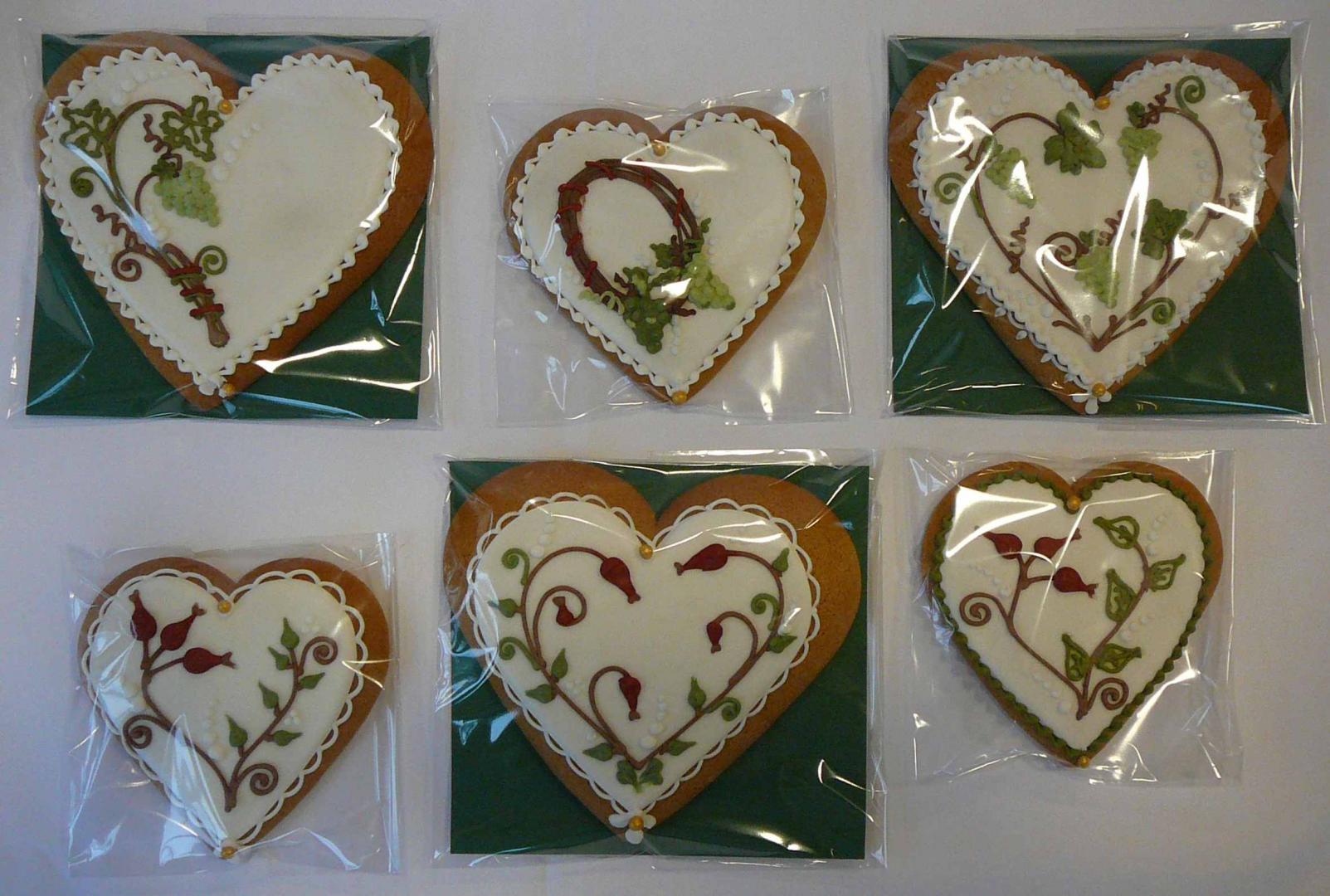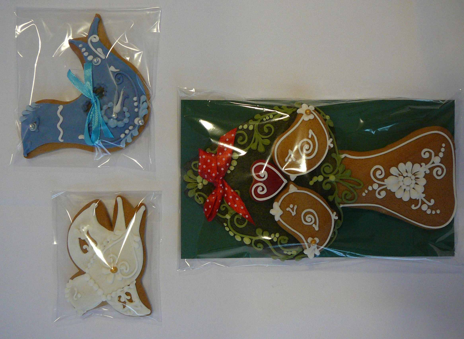 Védjegyes termékek: csipkebogyós és szőlő mintás szív, életfa madárpárral, madárfigurás-tulipános kék alapon és repülő madárfigurás fehér mázzal.